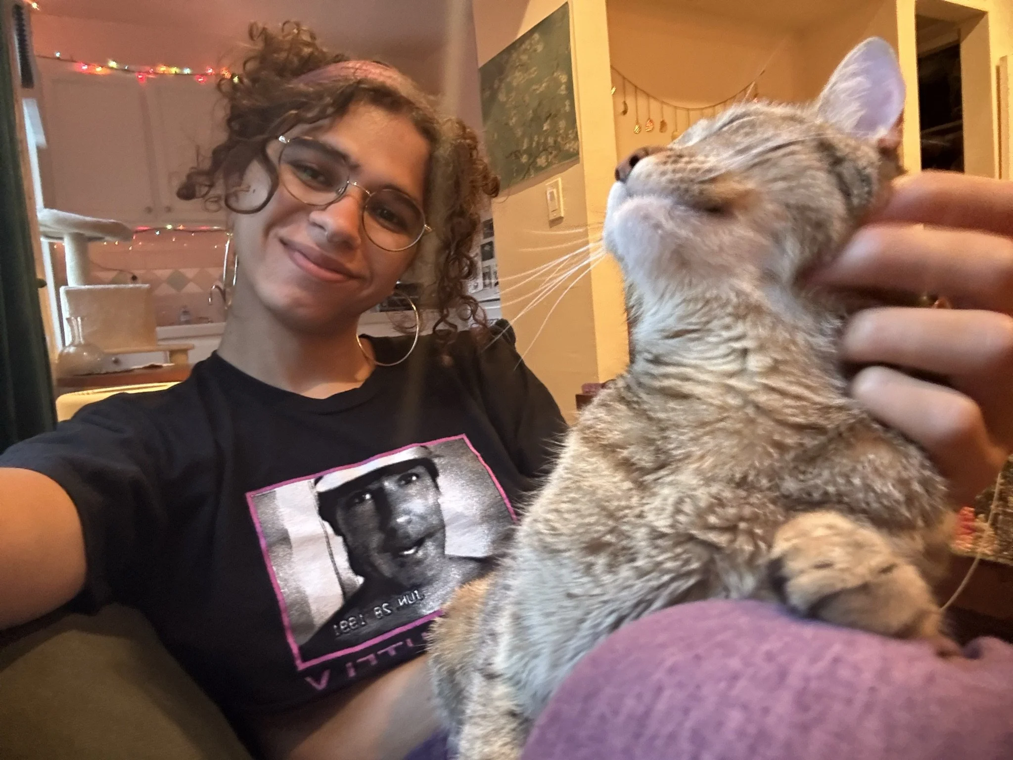 In her free time, she is part of mutual aid groups focused on being in community with her unhoused neighbors. In these spaces, she’s had opportunities to tutor monolingual speakers in English and Spanish, and is working to offer tutoring for GED test prep. Besides that, she enjoys reading, crocheting, being outside, and playing with her cat Tahini.